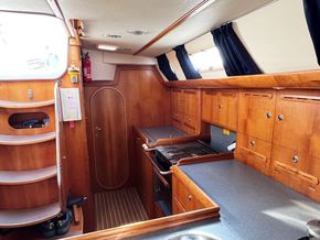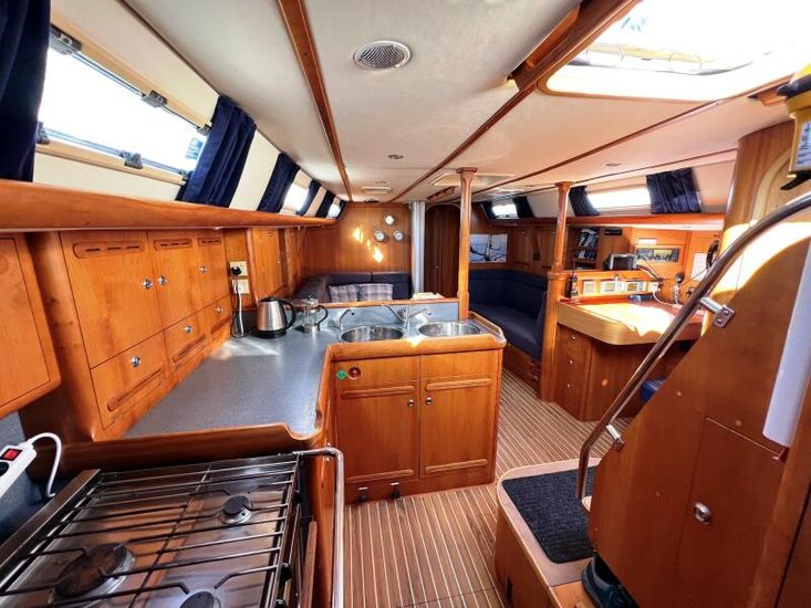 This yacht has been professionally remodelled, with the forward cabin converted into a large owner’s en-suite cabin. Below deck, the layout is well suited to extended offshore cruising, with excellent storage throughout and a warm interior finished in cherry joinery. Accommodation includes two double cabins plus a dedicated workshop and utility cabin, which is a valuable addition for longer passages. In addition, 230V power is supplied to all cabins.