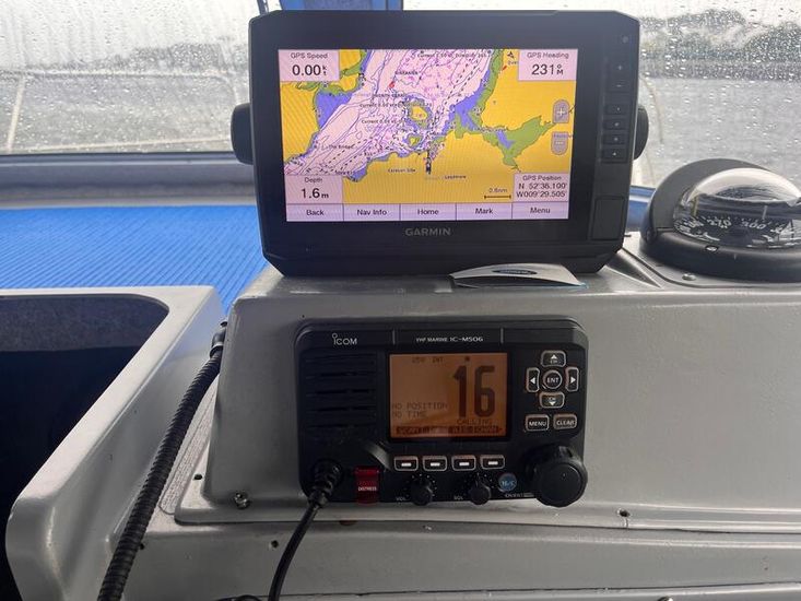 The electronics are modern, featuring a Garmin touch screen chart plotter, fish finder, and depth, along with an Icom DSC VHF.