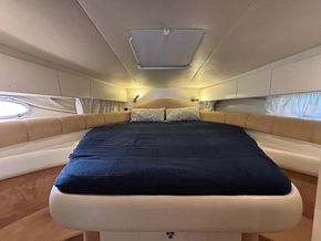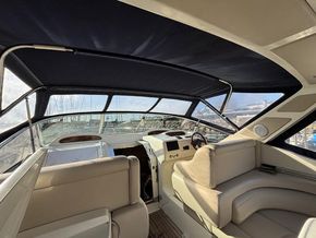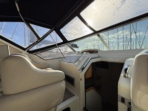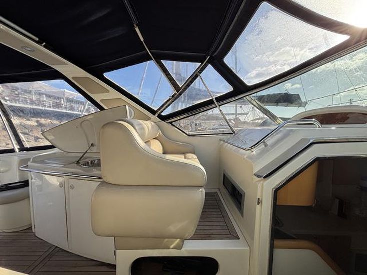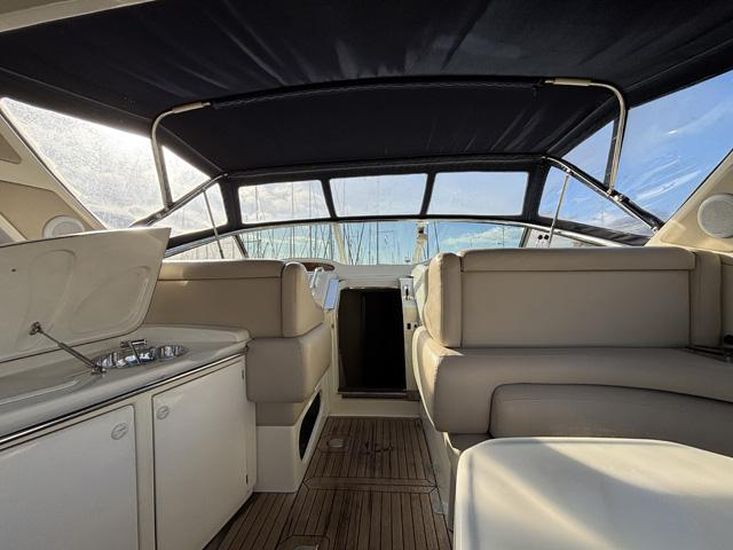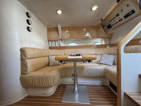 Cockpit lounge to starboard with U-shaped seating and table. Wet bar to port with sink, counter space and under-counter fridge. Two helm seats at the steering position plus two additional companion seats to port.