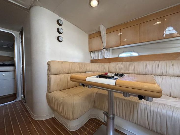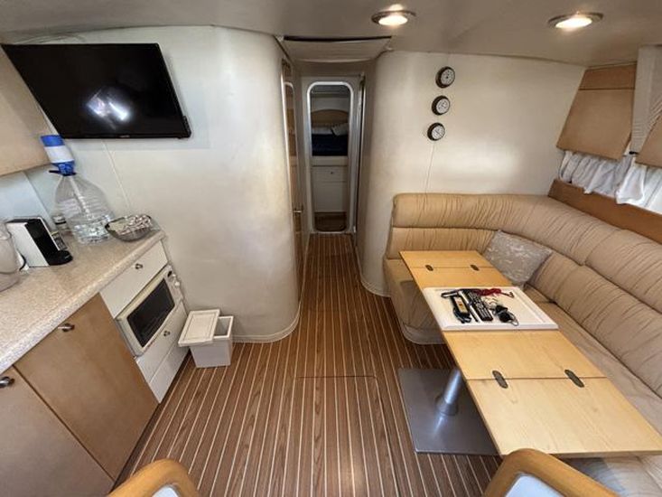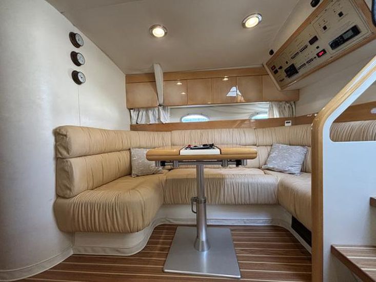 No interior, encontra um espaço luminoso e bem cuidado, com duas cabines confortáveis e um layout prático que torna cada saída agradável. A embarcação revela uma manutenção cuidada, com sistemas, estofos e acabamentos a apresentarem-se em muito boas condições para a sua idade.