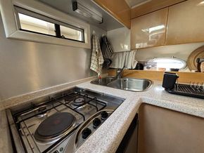 Carré avec banquette en U et table à manger à tribord. Cuisine à bâbord équipée d'une plaque de cuisson à trois feux, d'un évier double en inox, d'un réfrigérateur et d'un micro-ondes.