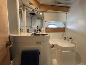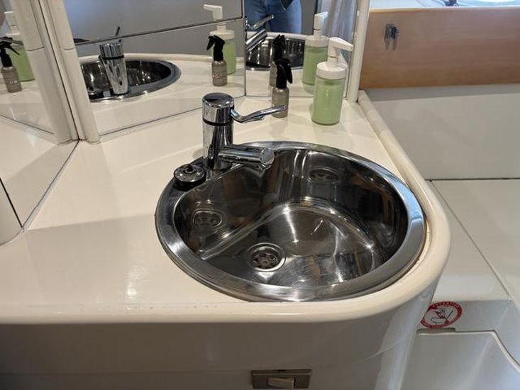 Forward master cabin with double berth and side storage lockers. Port guest cabin with twin bunk beds and wardrobe. Starboard head compartment equipped with electric toilet, pull-out shower and washbasin.