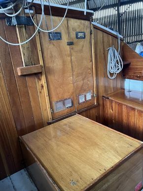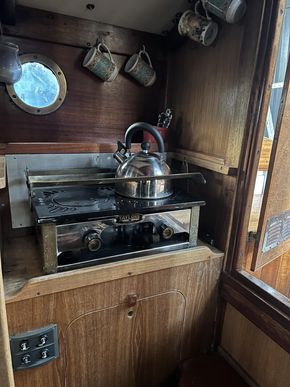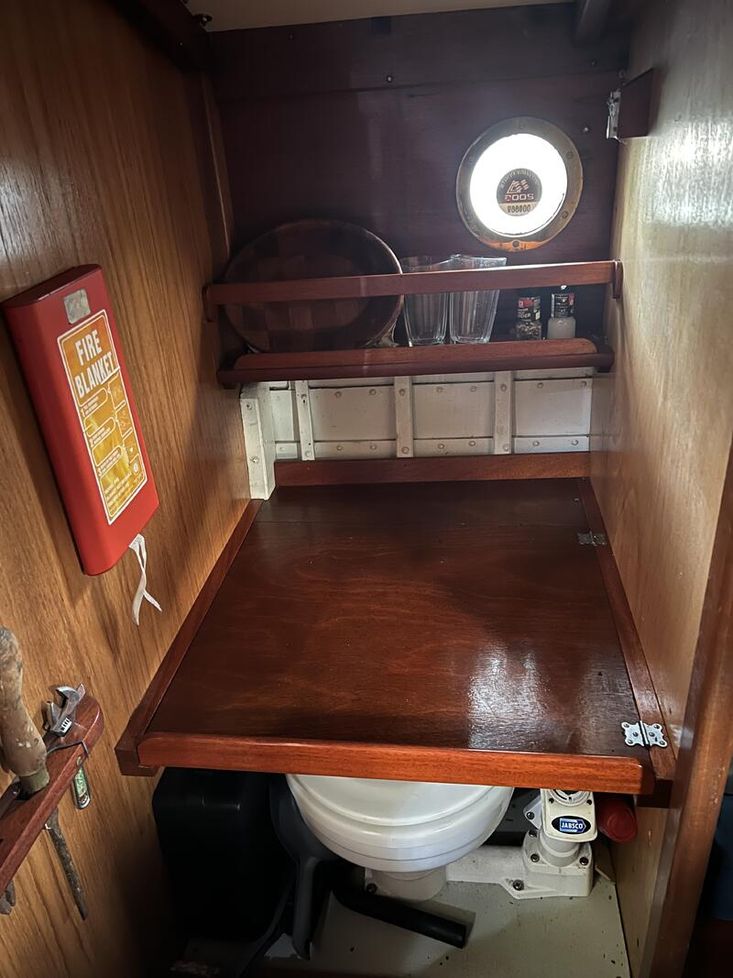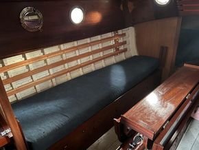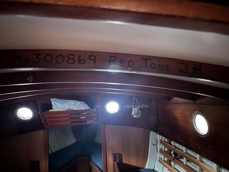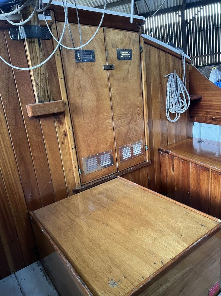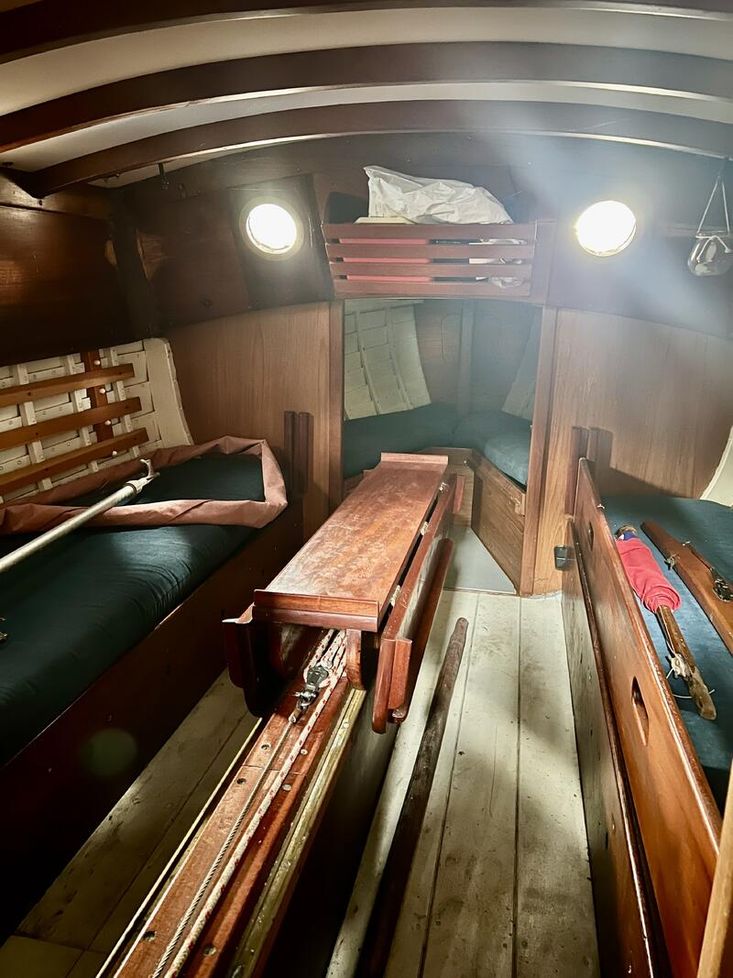 6 bronze port lights. Galley area with Taylor’s stove. Varnished folding table over centre board casing.