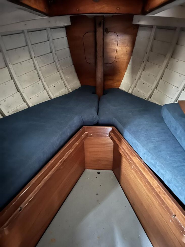 Double V berth in for peak and 2 single berths in main cabin, blue velour upholstery in good condition.