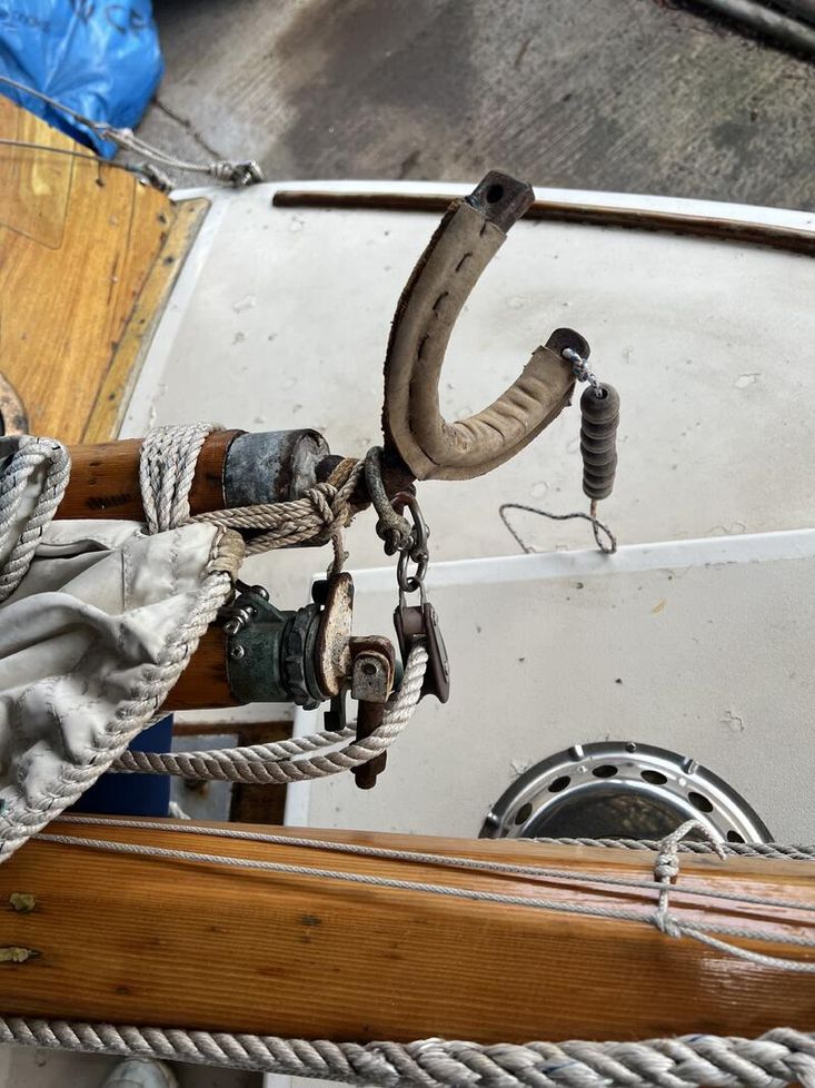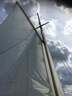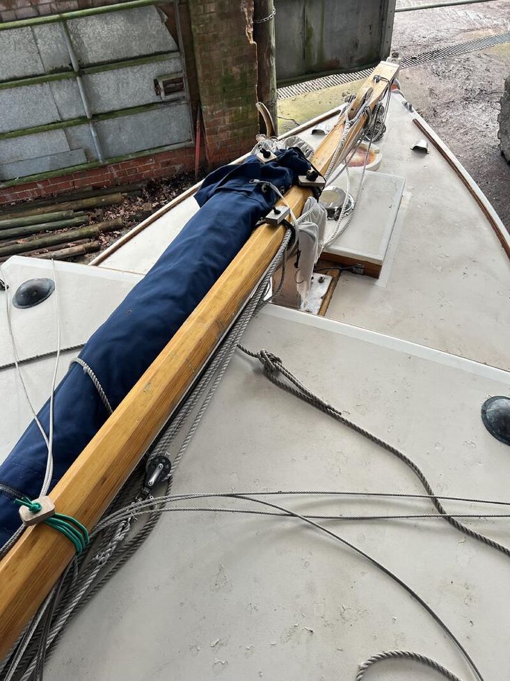 Gunter rig, mainsail good condition, jib in tan from Jeckells in 2019, roller reefing. Wooden mast and boom, good condition. Sail cover, fair.