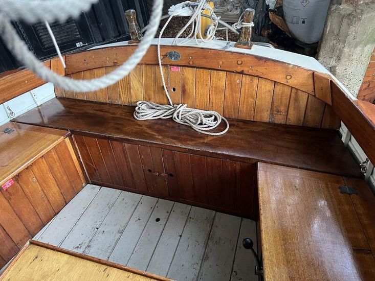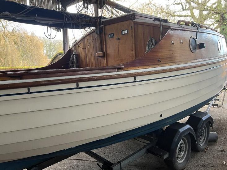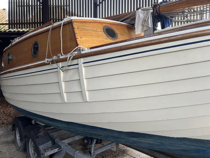 Wood clinker construction mahogany on oak. Cream painted hull sanded and re-painted in 2023. Varnished cockpit and cabin, well maintained.
