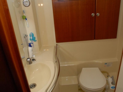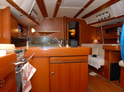 Bow cabin with double bed, wardrobe and separated shower zone. Good size salon with U-shaped sofa and table at port and long sofa at starboard. L-shaped galley at port with stove, oven, fridge and large counter with stainless steel sink, water foot pump and microwaves. At starboard big chart table and complete bathroom. In the aft 2 cabins, both with double bed and wardrobe.