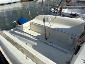 Spacious cockpit with tiller steering, outboard engine, and seating on both sides, with a locker to starboard. Spacious interior with central table and settee seating along both sides. V-berth forward. Bathroom with marine toilet to starboard and a small galley to port. Astern, a single berth.