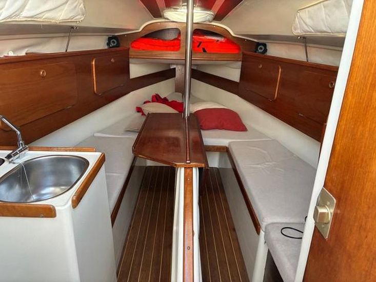 Cockpit spacieux avec barre franche, moteur hors-bord et banquettes de chaque côté, avec un coffre à tribord. Intérieur spacieux avec table centrale et banquettes de chaque côté. Couchette double en V à l'avant. Salle d'eau avec WC marin à tribord et petite cuisine à bâbord. À l'arrière, une couchette simple.