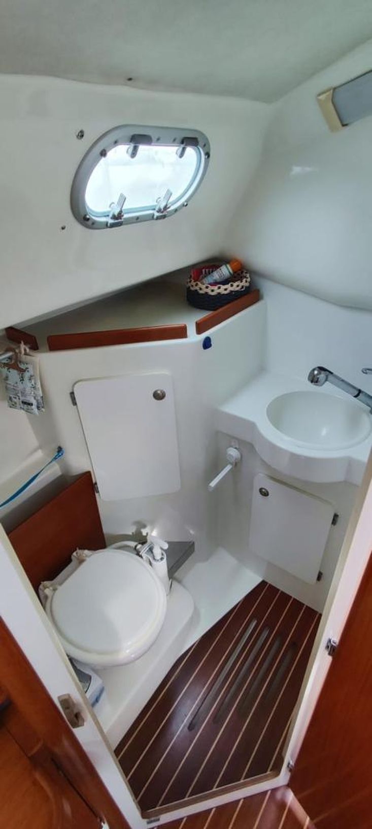 À bâbord, salle d'eau entièrement équipée avec douche et WC manuel.