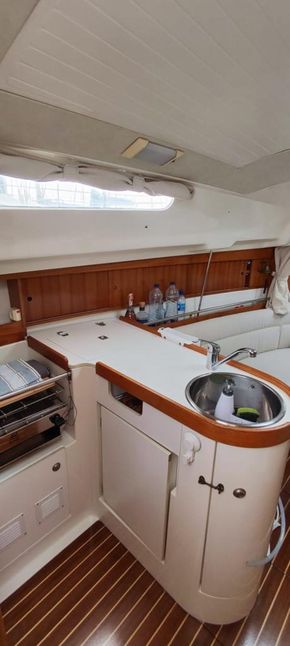 To PS, fully equipped galley with stove and stainless-steel sink, hot and cold pressurized water.
