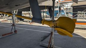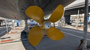 Volvo 180 hp engine with shaft drive and Aqua Drive system, 4-blade Flexofold folding propeller with rope cutter, automatic engine room fire extinguisher, manual, automatic, and emergency bilge pumps.