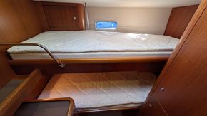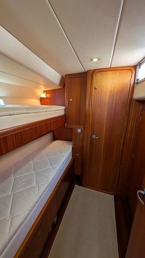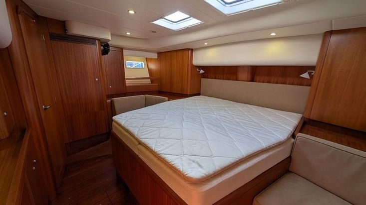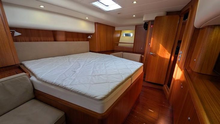 Cabine de proprietário na popa ocupando toda a boca do barco, com casa de banho privativa e cabine de duche separada. Cabine de proa com cama de casal central e duas cabines adicionais com beliches. Interior em mogno africano e Jatobá brasileiro em estado próximo do novo.