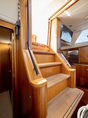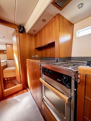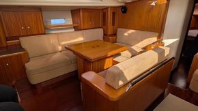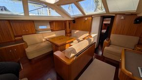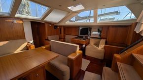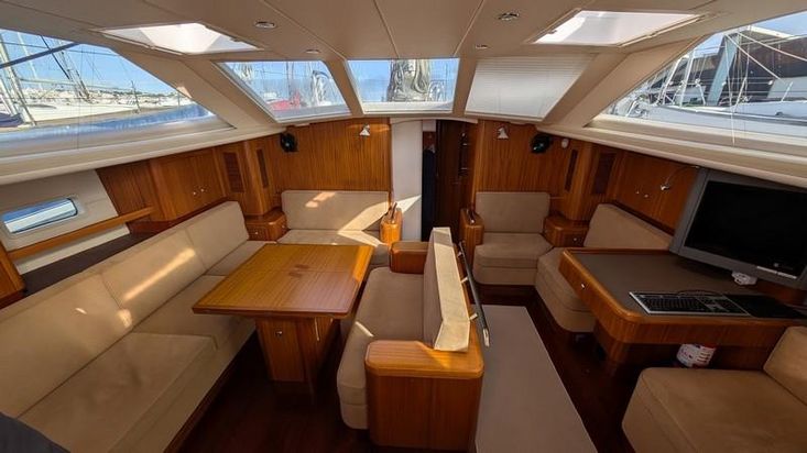 Le carré, occupant toute la largeur du bateau, est extrêmement spacieux et lumineux. Il est doté d'un canapé d'angle à bâbord et d'une table à manger centrale extensible signée Najad. À tribord se trouvent la table à cartes entièrement équipée et des sièges supplémentaires. Éclairage LED à intensité variable, sellerie en Alcantara clair et nombreux rangements.