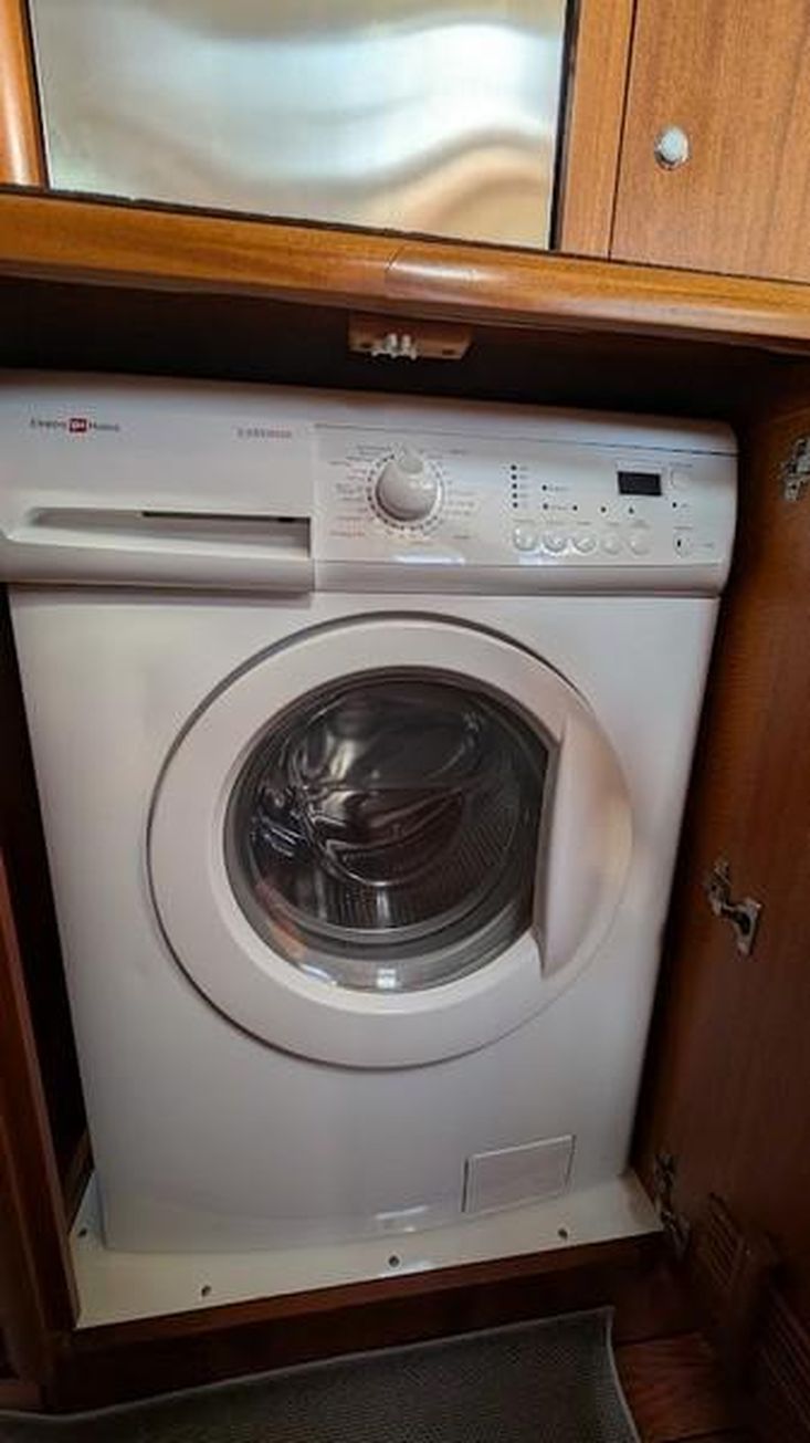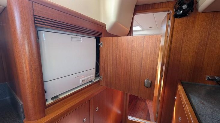 Cozinha a bombordo tipo “chef”, com amplas superfícies em Corian, dois lava-loiças inox, água quente/fria pressurizada, vários frigoríficos e congeladores, micro-ondas, máquina lavar/secar e máquina de lavar loiça.