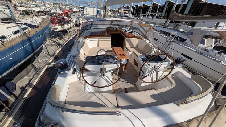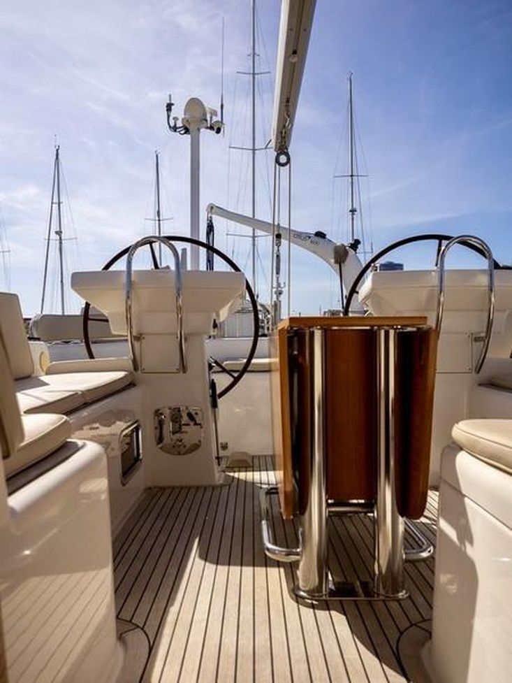 Cockpit central seguro e protegido com para-brisas fixo, duas rodas de leme com controlos de motor, mesa de cockpit dobrável em teca, almofadas, sprayhood e extensões. Convés e cockpit em teca maciça.