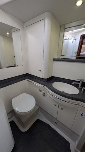 Full-beam aft owner’s cabin with en-suite head and separate shower stall. Forward cabin with central double berth and two additional bunk cabins. Interior in African mahogany and Brazilian Jatobá in near-new condition.