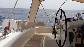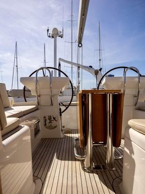 Cockpit central sécurisé et abrité avec pare-brise fixe, double barre à roue avec commandes moteur, table de cockpit pliante en teck, coussins, capote de descente avec rallonges. Pont et cockpit en teck massif.