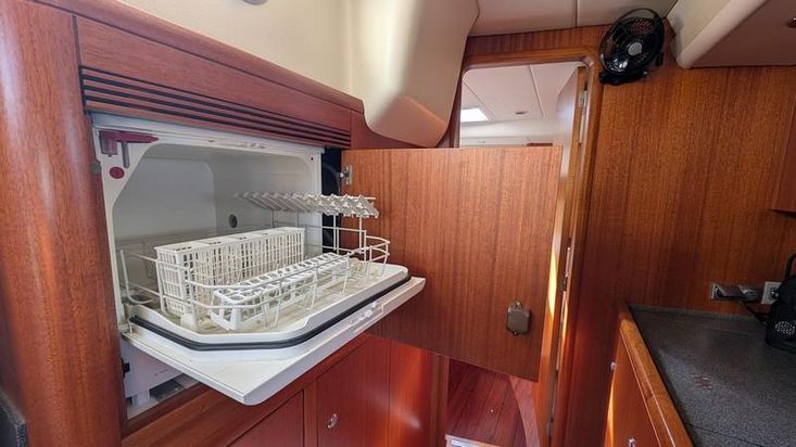 “Chef-style” galley to port with large Corian worktops, twin stainless steel sinks, pressurized hot and cold water, multiple fridges and freezers, microwave, washer/dryer, and dishwasher.