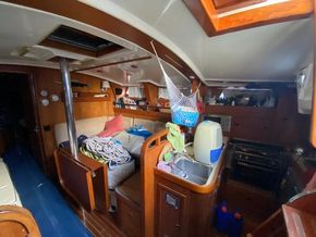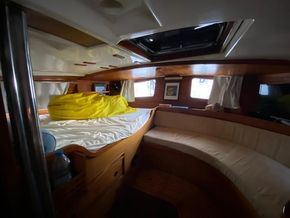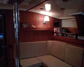 Saloon with dining table and port-side sofa, and a long starboard sofa (convertible into a single berth). Fully equipped galley and comfortable chart table.
